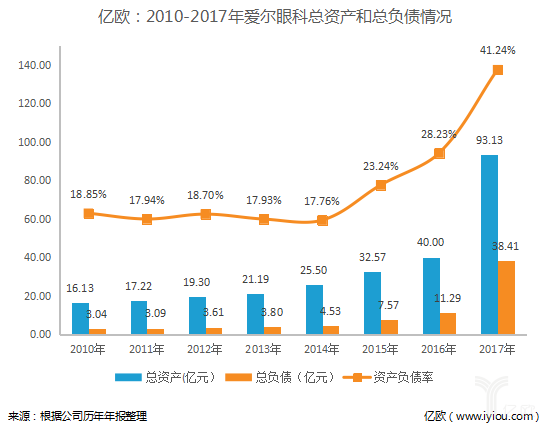 从2010年-2017年爱尔眼科总资产、总负债情况看,爱尔眼科的资产负债率虽有上升,但整体偏低。爱尔眼科的未来究竟会怎么样呢?亿欧大健康拭目以待。