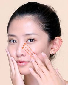 6、用力将脸颊全部肌肉朝内眼角方向推压,在眼角下按压3秒。然后减轻力度,向外水平滑动,反向重复。