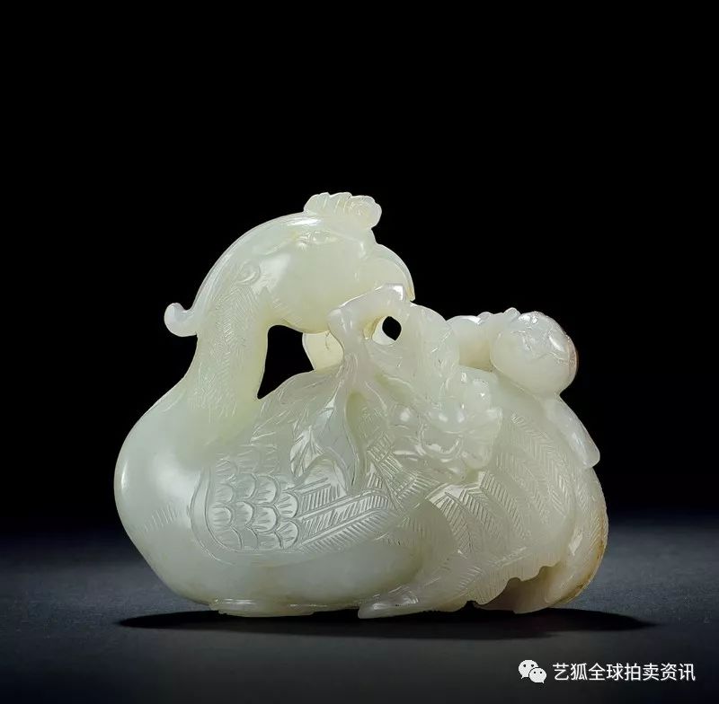 亚洲私人珍藏青玉凤凰,质地细腻莹润,玉雕塑造一隻雏凤,羽翼收拢停息,回头张望。凤鸟头部雕琢精细,口衔牡丹,回首而望。双翼以圆雕刻出,翎羽煌煌,收束于身下,整个玉雕浑圆柔润,将圆雕、线刻等多种玉雕手法现结合,雏凤的形象表现的自然生动。玉凤所衔牡丹,花头硕大,富贵吉祥。此玉雕设计精巧,是十八世纪十分具有艺术水淮的作品,应是当时富贵高雅之士的把玩之物。