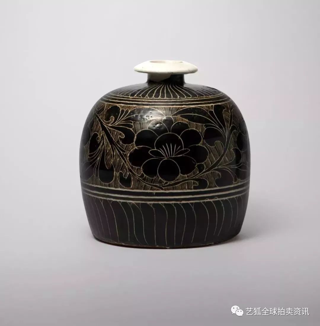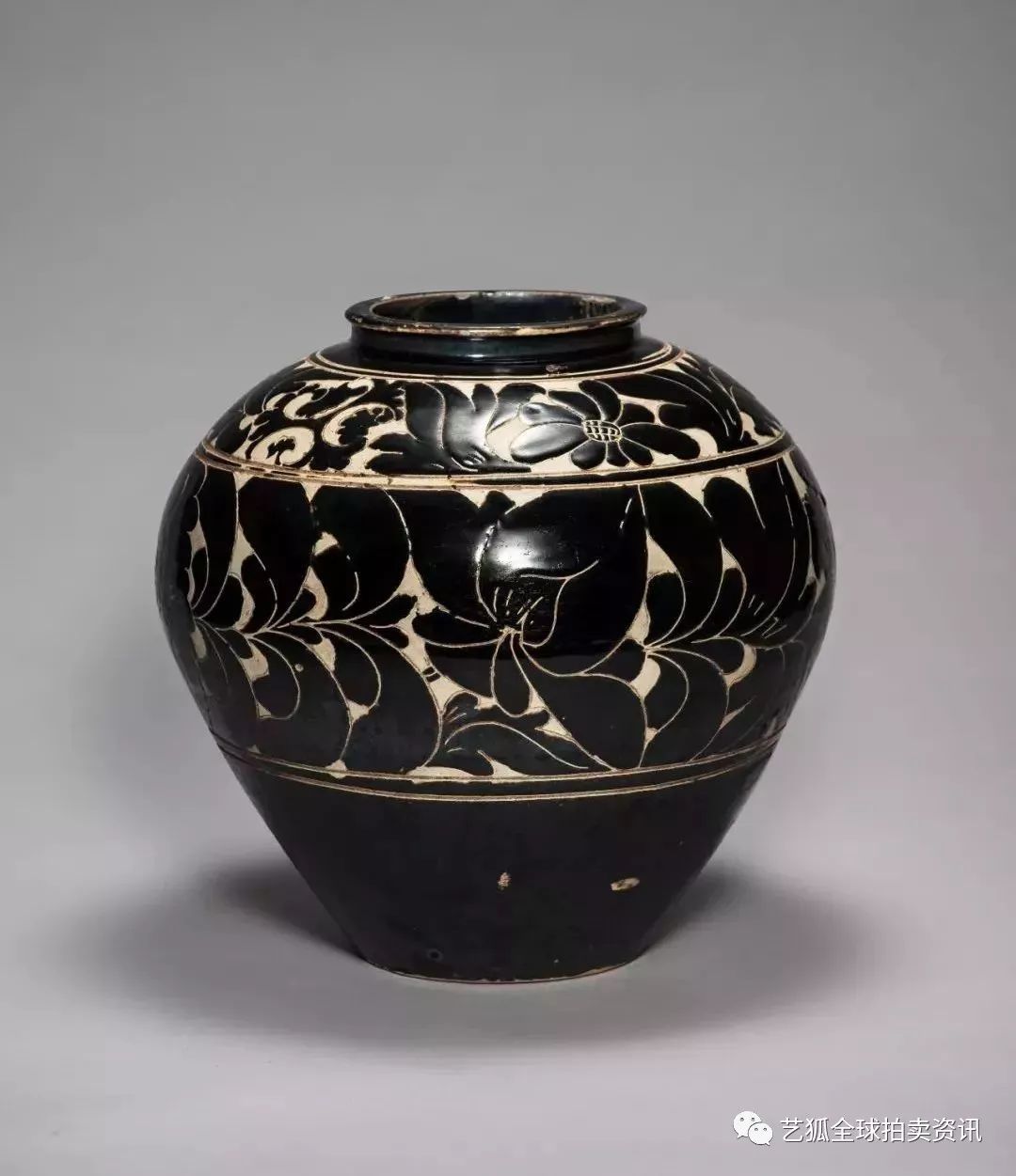 金/元 磁州窑黒釉剔花牡丹纹罐