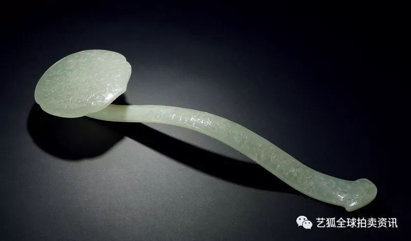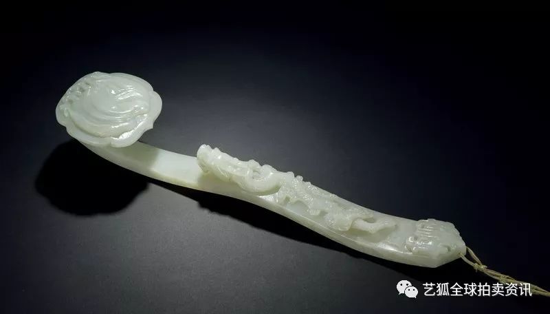 亚洲私人珍藏玉如意以整块白玉雕琢而成,白玉质肥腻莹润,体量较大,如意首内高浮雕一桃果累累,有福寿双全之美意。柄部圆雕一条游龙,穿梭于祥云之间,龙鬚飘逸,神态威严,身形矫健,遒劲威猛。柄部末端浮雕蝙蝠纹。在清代宫廷,如意被广泛视为祥瑞的象徵,成为朝贺、祝寿、喜庆时不可或缺之物。此如意整器造型结构严谨有度,气势磅礴,艺术感染力极强。