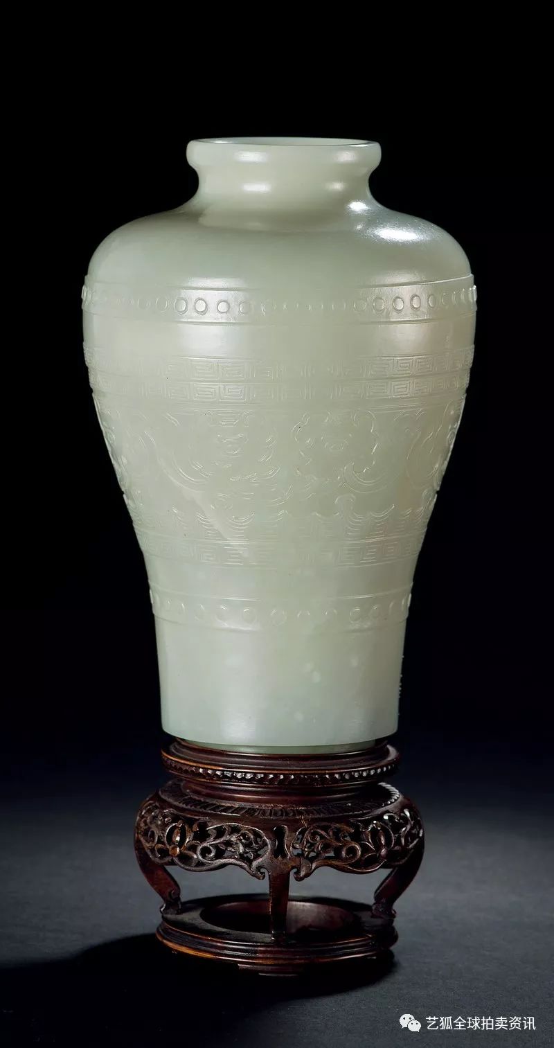 北美私人收藏此瓶古雅端庄,为梅瓶,唇口,直颈,丰肩,收腹,造型端庄典雅。瓶肩部环绕一圈乳钉纹,腹部以两圈窄回纹,主题纹饰为一周浅浮雕带状䕫龙纹,云气缭绕。胫部仍装饰一圈乳钉,与肩部呼应。玉瓶仅以宽窄不同的纹饰带装饰,具有起伏的韵律感。通观此瓶,用料精良,玉质洁白温润,凝若浓脂,刀工细腻流畅,造型古朴厚重,琢刻规整,精工细作,雍容华贵,底刻“大清乾隆年製”款。