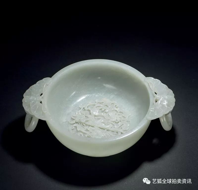 玉洗青白玉质,色泽白中微微泛青,纹理緻密,肥厚莹润。宝器以整玉掏挖而成,深腹,其两鋬雕琢成一对蝴蝶相向而飞,触鬚细长,碟羽伸展略成扇形,其上纹路毕现,雕琢精緻。鋬手之下分别琢一对活环。洗心以高浮雕琢出缠枝莲花,莲花硕大,枝蔓缠绕,层次丰富,尽显雕琢工艺之高超。底下承四段短足,与洗型相配,端庄典雅,显示了乾隆时期玉雕的高超技艺,是料工皆胜的难得佳品。