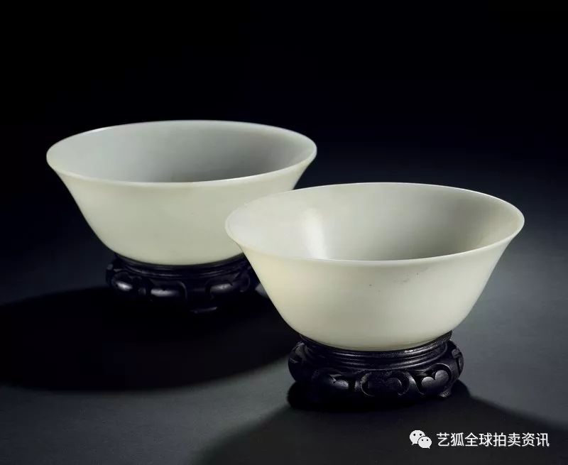 亚洲私人珍藏玉碗一对为青白玉质,纹理緻密,通透光洁。玉碗口沿外撇,腹部渐敛,底承圈足。通体光素无饰,抛磨精良,配有木座,简洁端庄,具有优美典雅的审美效果。而此品大巧若拙,大美无形,无繁缛雕砌之弊端,将精美蕴藏与平淡朴实,是19世纪玉雕作品中的杰作。