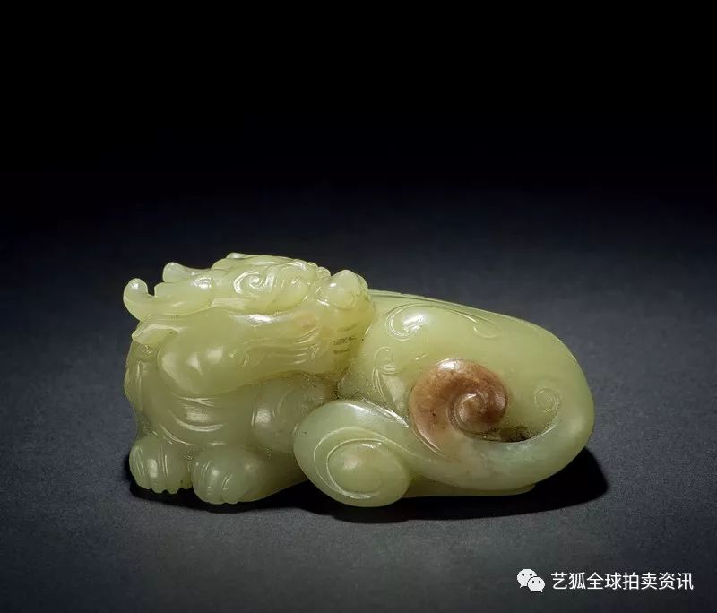 黄玉带皮瑞兽,呈俯卧状,回首张望,尾部分叉分向两侧卷曲,盘于身侧,四隻攒握,怒目卷眉,尖耳后贴,双角上卷,精神奕奕,神态威严,刀工流利顺畅,肌理圆润饱满,体态自然协调,背脊作成多道凸棱状,张显力度。形态生动,刀法闲熟。线条曲转流畅,全以神似取胜。