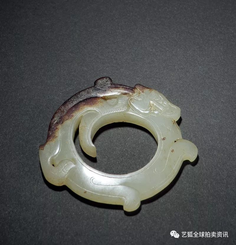 亚洲重要私人收藏玉环为白玉质,润如凝脂,有沁色。琢成螭龙,龙团身咬尾,形成圆环,造型别致。龙身以细线浅刻,勾画出龙吻、鳍、爪等细部,线条流畅绵长,犹如春蚕吐丝。此环形制规整,玉质温润,刻工精湛,沁色自然,打磨精细,造型自然简约,有汉代浑厚凝练的审美意趣。