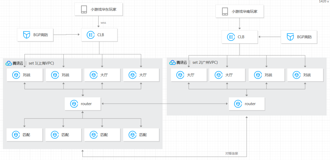 下图就是扩展星型结构在腾讯云上的一个实践,针对实时性要求高的游戏,比如坦克大战这样的游戏,可以多点部署,让玩家就近接入,华南的玩家接入到广州的 VPC,华东的玩家接入到上海的 VPC,两个 VPC内部分别部署了 set1和 set2,并且通过跨域对等连接打通,使得router1和 router2能够建立内网连接,实现全区全服。