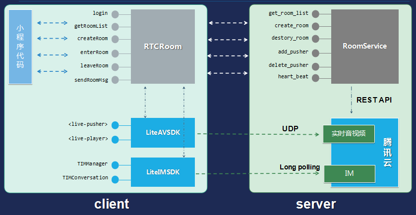 多人通话:双人通话的时候是单对单的传输,但是在多人通话态势时,信息是多对多的传输,这个时候需要一个总控系统,去协调不同端的态势,协调各个端的输出,包括什么时间点谁说话,谁不能说话。腾讯视频云团队,基于小程序自定义组件的设计标准,实现了一套被称作 RTCRoom的解决方案,用于对视频房间进行态势同步和统一管理。