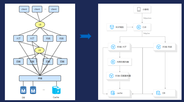 先来看下图(左)的无态势化分层架构,架构图如下图所示,简单说就是按照服务调用关系对节点进行分层,层和层之间由 LB(负载均衡)进行衔接,LB下的节点可以灵活的进行伸缩,这个架构其实就是常用的 web架构,应对一般的休闲类游戏也是够用的。