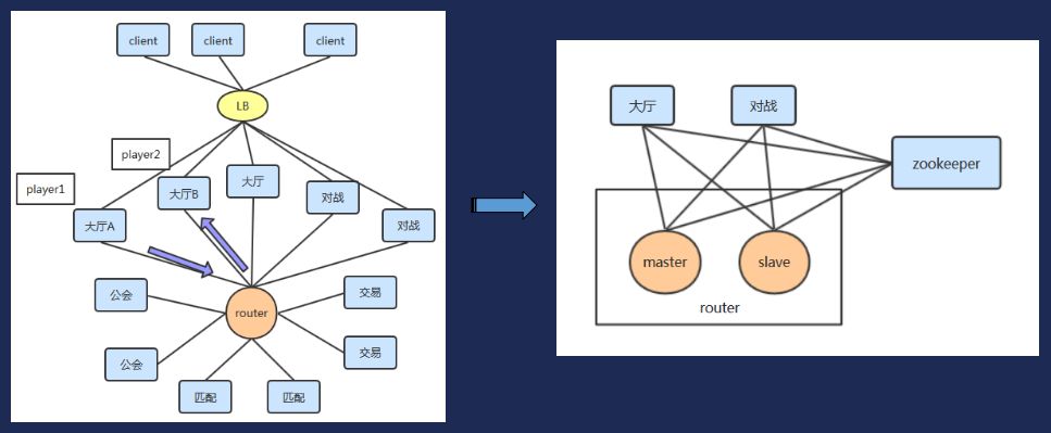 不同节点之间通过 router进行通信,router是实现节点间消息转发的服务器。比如说 A节点中的 Player1对象要向发送 B节点中的 Player2对象发送组队邀请,可以将消息发送到 router,router再转发到 B节点处理之后再发送到 Player2的客户端。在这个结构中,所有的节点都是对等的关系,任何两个节点通过 router都可以实现消息互通。但是这个图有一个明显的题:router是一个单点,有容错性问题和可扩展性问题。针对容错性问题,可以通过引入主备机制来解决,借助 zookeeper可以实现主备的自动切换,当主节点不可用时,自动切换到备节点。