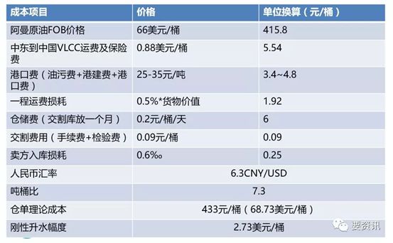 华泰期货也以迪拜交易所的阿曼原油为基准计算了国内原油仓单成本,理论上为433元/桶。
