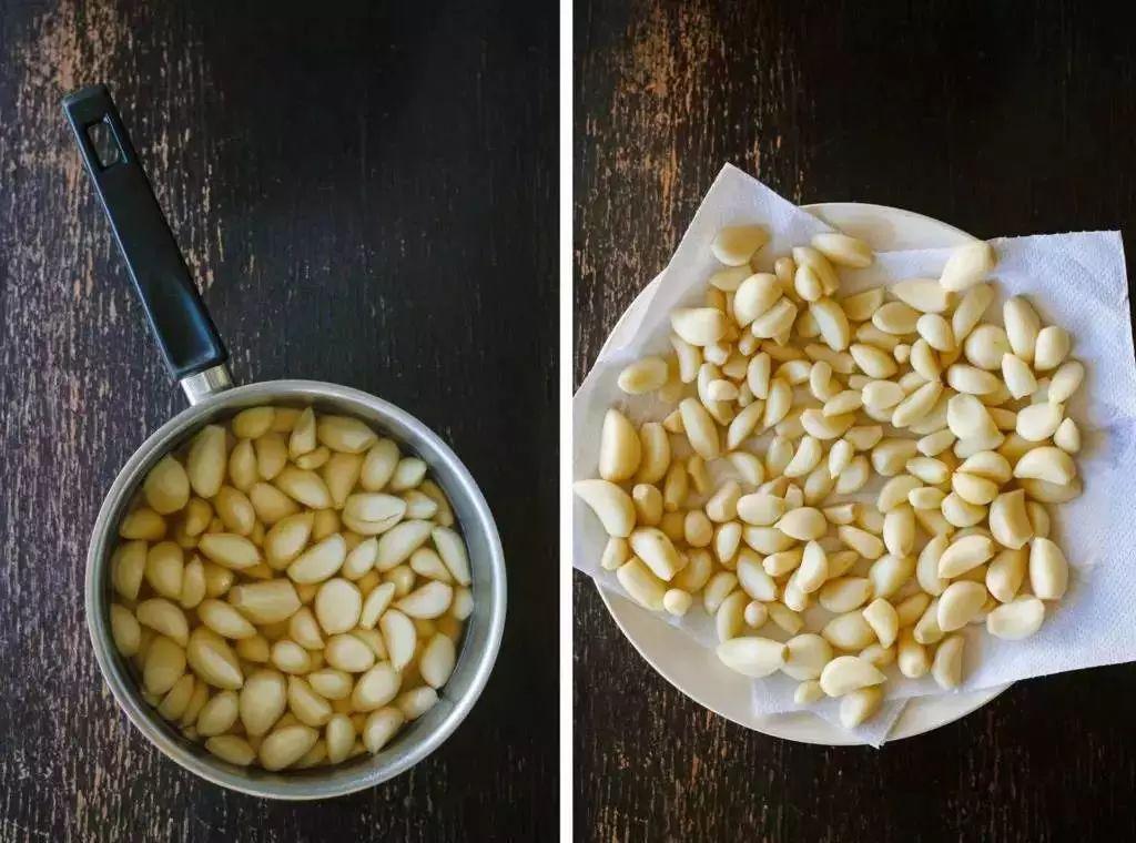 选用新鲜的蒜头,去掉根须和蒜衣。
