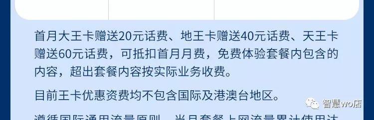 ·首月王卡赠送20元话费,地王卡赠送40元话费,天王卡赠送60元话费,可抵扣首月月费,免费体验套餐内包含的内容,超出套餐内容按实际业务收费月。