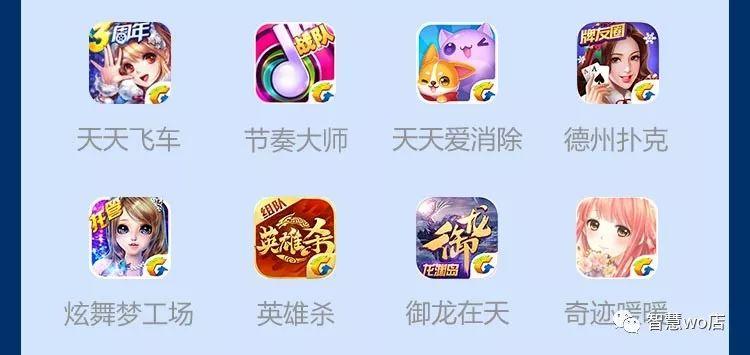 王者荣耀、穿越火线手游、QQ飞车、荣耀使命、欢乐斗地主•腾讯、自由幻想手游、奇迹MU:觉醒、火影忍者手游、天天酷跑、QQ游戏、魂斗罗:归来、QQ降龙、掌上英雄联盟、英雄杀、御龙在天、奇迹暖暖、热血传奇、节奏大师、欢乐麻将全集、天天爱消除、全民飞机大战、QQ牧场、全民农场、全民水浒、全民闯天下、全民超神、全名枪王、天天德州、天天象棋、天天星连萌、天天来塔防、天天炫斗、天天富翁、天天风之旅、欢乐西游、欢乐王国、潮爆三国、九龙战、进击的女神、雷霆战机、勇者大冒险、脑力达人、拳皇98、蜀山传奇、糖果传奇、我叫MT2、驯龙战机3D、炫舞梦工厂、夜店之王、战争总动员、英雄无敌等其他腾讯系游戏。