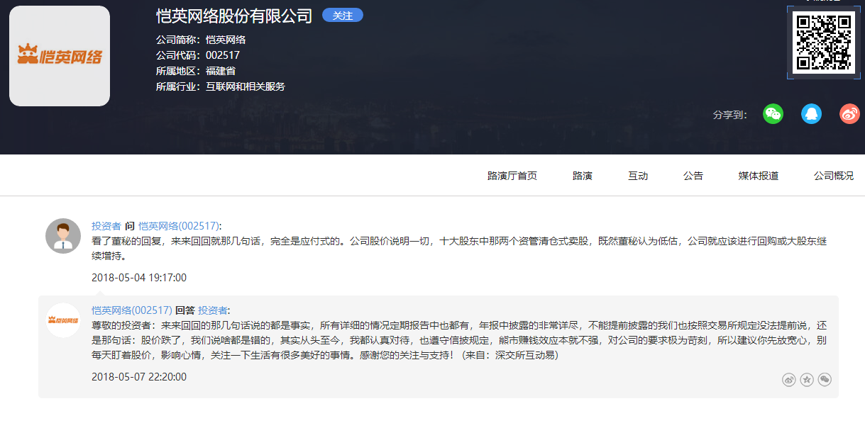 针对股价的表现,有投资者在投资者关系互动平台上提出,“是否觉得公司目前股价已严重低估?金丹良等合作方股东巨资买入公司股票后,股价已跌去一半,管理层是否感受到来自股东的压力?”,恺英网络表示,公司股价下跌,管理层会感受到压力,未来会继续做好主营业务,回馈股东!