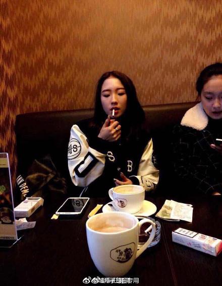 照片上的女孩确实很像孟美岐了,应该是在一家咖啡馆里面,叼烟和点烟的姿势都非常熟练。