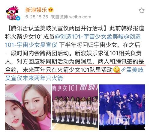 过了几天,孟和吴的原经纪公司乐华&Starship又说,她们不会离开组合,未来两年会两边跑,还diss了孟和吴把微博名字从“宇宙少女”改成“火箭少女”是违规的。