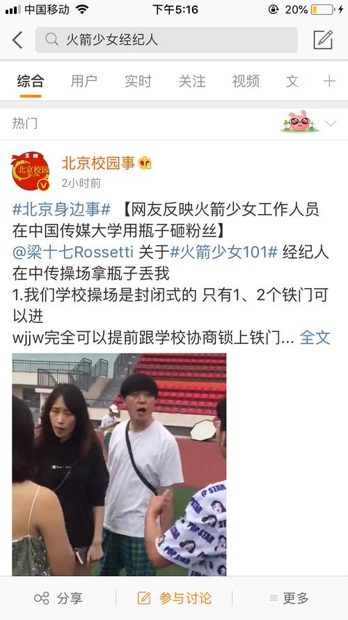 成员身体不好,经纪人的脾气也不是太好。前几天少女们在中国传媒大学拍摄,经纪人冲上了热搜,起因就是他在人家中传的操场上,拿着瓶子要砸学生粉丝。