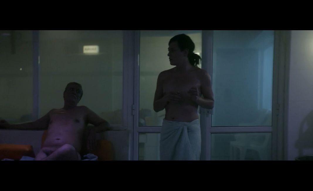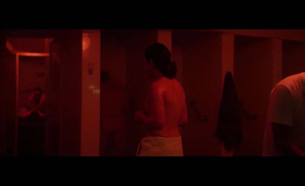 玛丽娜走到女士区,她用白色毛巾包裹住腋下的整个身体,而当她不得不到男士区寻找柜子时,她将毛巾取下,只裹住了下半身。