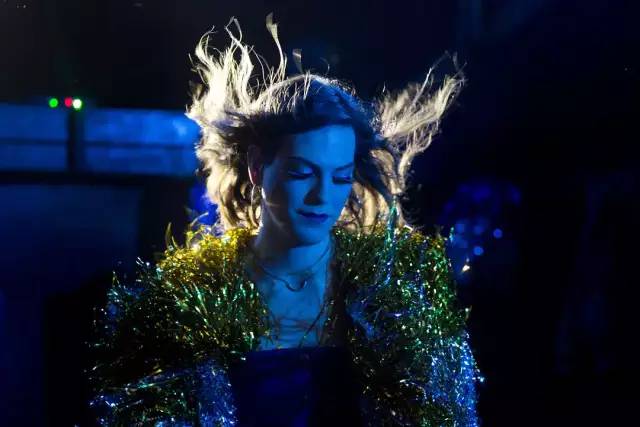 她在七彩灯光(隐喻彩虹旗)下,缓步向前行走,她跨越了性别。