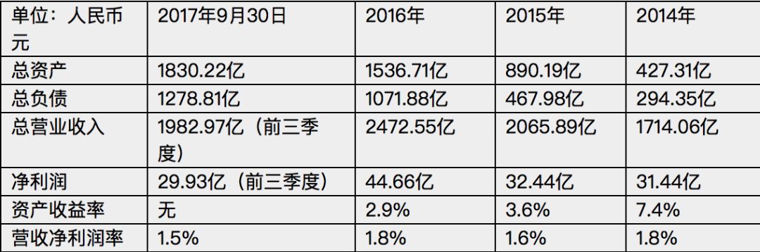 从2014年至2016年的数据可知,这家企业的资产规模几乎处于连年翻番的水平,其营业收入也逐年扩大,自1714.06亿元扩大至2472.55亿元。在上述两项数值迅速扩大之时,这家公司的净利润绝对值却没有跟上,总额为31.44亿元、32.44亿元、44.66亿元。反映了其获利能力的指标——资产收益率反而处于逐年下滑的境地,自7.4%下滑至2.9%,这一数值甚至无法覆盖银行融资水平。反映其赚钱能力的营收净利润率更是长期处于低于2%的水平。