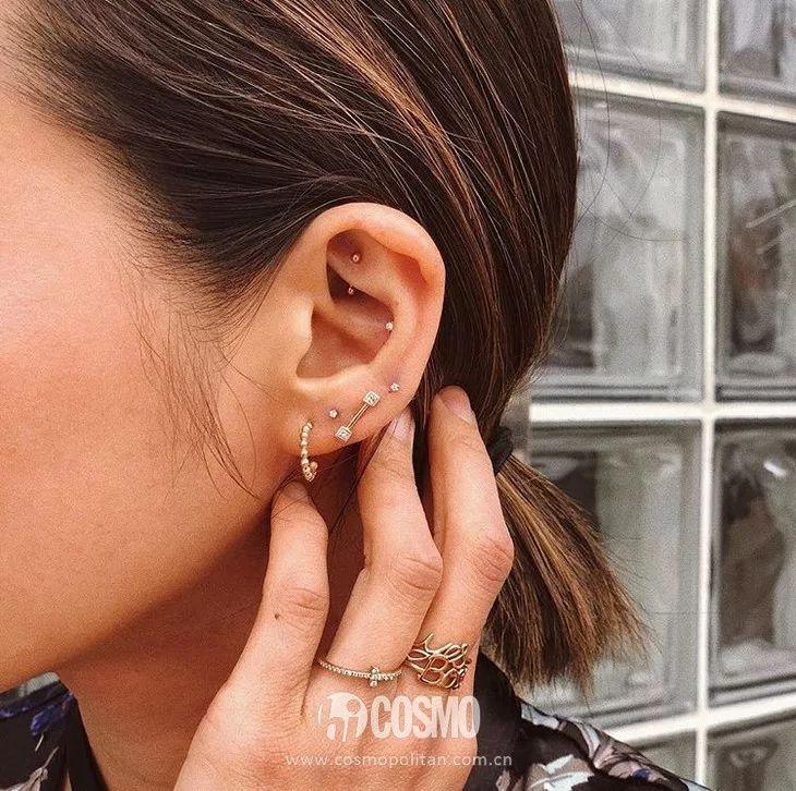 这种戴法是COCO比较推荐的,叠戴项链的时髦潮流其实还没有过,叠戴耳钉更让“耳朵上的风景”更美。