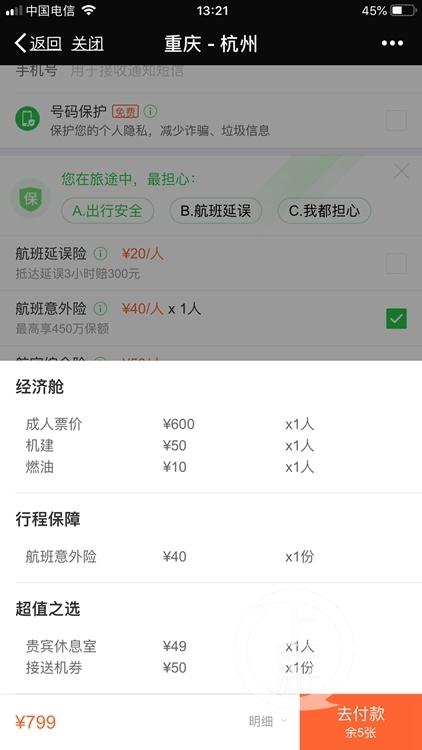 比显示价格高出199元,点击“明细”键显示,除机场建设费50元,燃油费10元为固定费用外,还包括了“航班意外险40元,贵宾休息室49元,接送机券50元。”这三项费用加在一起139元,属于旅客不应当支付的费用。