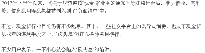 2017年12月1日,中国人民银行金融市场司联合银监会普惠金融部共同下发《关于规范整顿“现金贷”业务的通知》,给出了现金贷的开展原则,和存量现金贷的清理整顿要求。其中,在利率方面规定,各类机构以利率和各种费用情势对借款人收取的综合资金成本,应符合最高人民法院关于民间借贷利率规定,禁止发放或撮合违反法律有关利率规定的*款贷**。