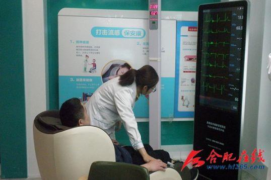 “药店专门设置了三分钟快速身体检测仪器,三分钟的时间就可以对人体进行快速的体检,系统能读取相关数据并给予专业的分析,指导用药、运动、膳食,方便市民更好地了解自己的身体。”安徽省药品零售行业协会会长周双才介绍道。