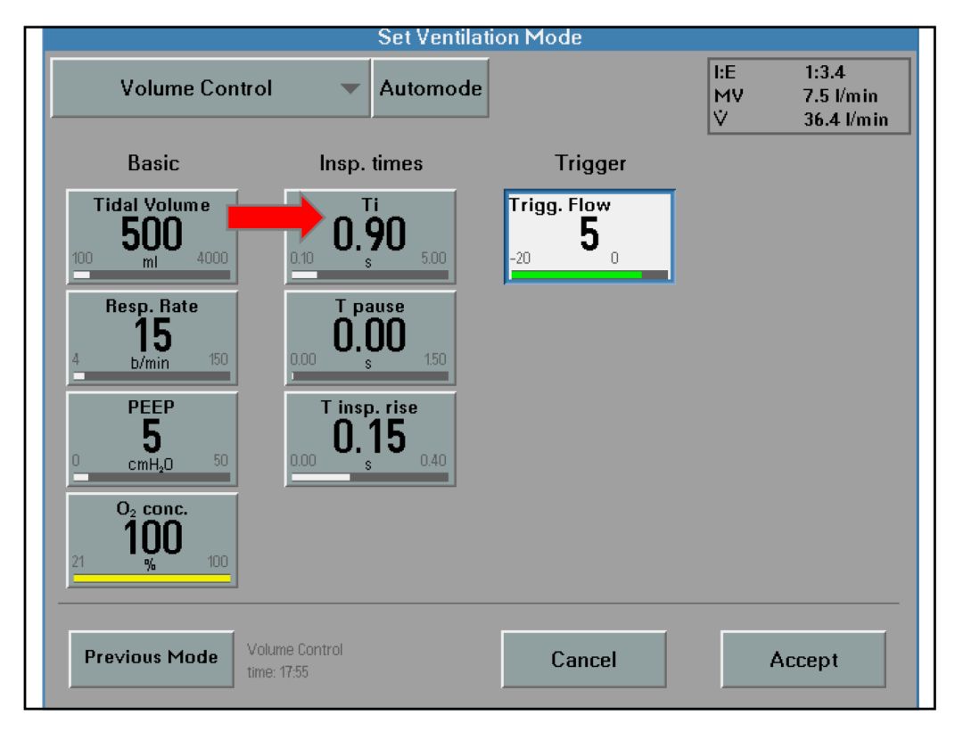 吸气时间(Insp. time)=0.1-5s,吸呼时比(I:E) ≤1:2;