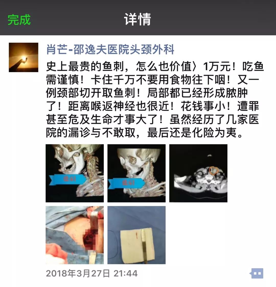 前天,浙江大学医学院附属邵逸夫医院耳鼻咽喉头颈外科副主任肖芒主任医师的一条朋友圈,五张略显血腥的配图,再次把爱吃鱼的宝宝们吓了一跳,也给那些误吞鱼刺习惯性吞米饭、吞菜的市民敲了敲警钟。