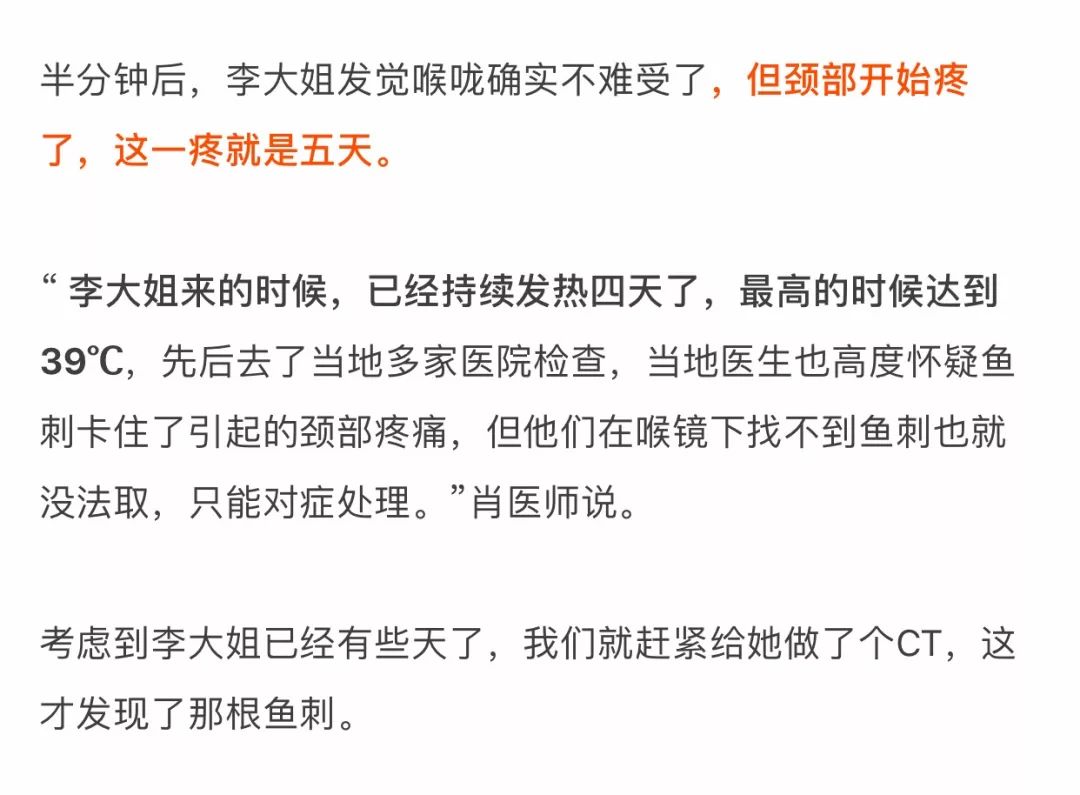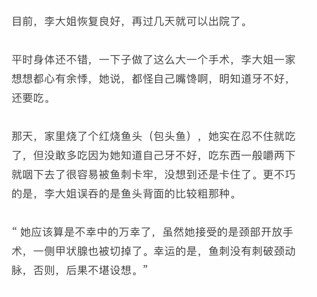 “ 临床上,像李大姐这种情况的患者并不少见,我们一年大概会接诊到七八例(特指需要通过从颈部切开取鱼刺的患者),他们有个共同的特点,都是卡住以后不停地吞东西,结果,吞吞吞,把鱼刺越推越里面,卡在了颈部。”肖芒医师说。