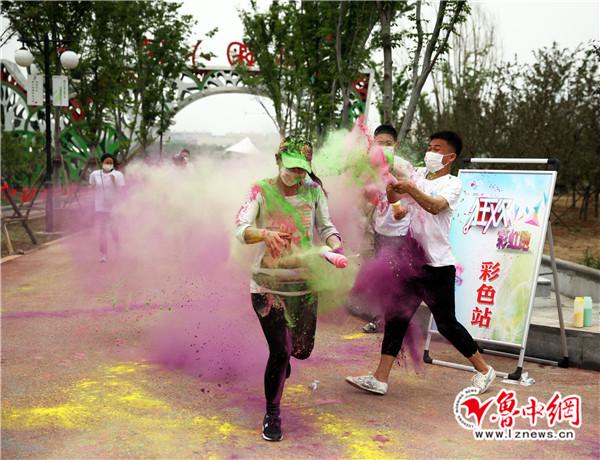 参加彩虹跑的游客经过途中彩色站时被喷洒颜色