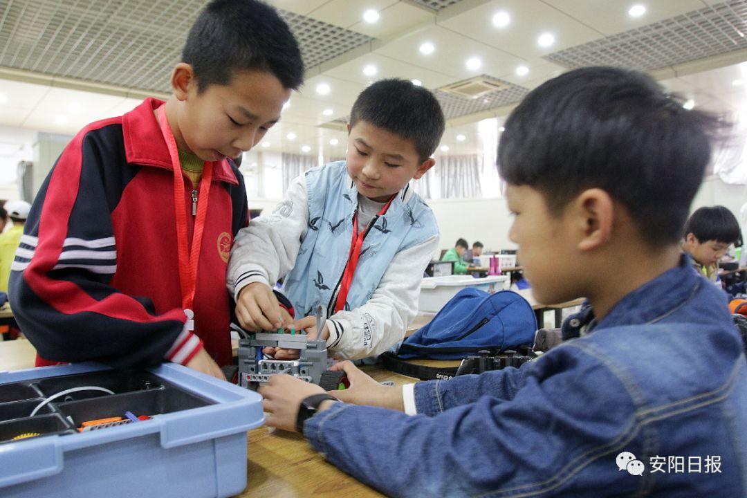小选手通力合作组装机器人。(记者 麻翛然 摄)