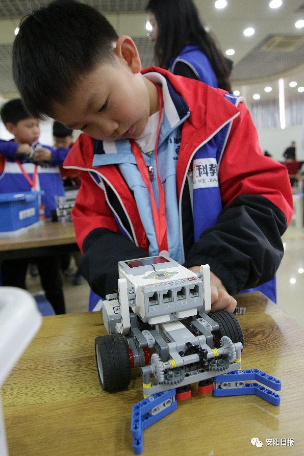 一个个零件在小选手手中组成功能各异的机器人。(记者 麻翛然 摄)