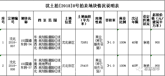 从公开资料上显示,102国道东侧-34、102国道东侧-37两宗地块位于沈北新区,占地面积分别为72651平方米、25408平方米,用地性质为商业(其它服务设施),容积率均为不大于1.0,商业比例100%,出让年限40年,起拍价格为900元每建筑平方米。