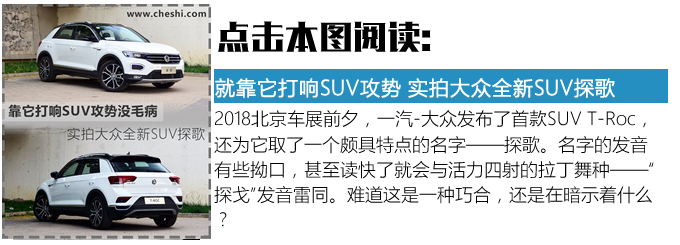 其实探歌是一款不折不扣的全球车型,海外版命名T-ROC。从探歌的中文命名不难看出,它是为自由而生的。在这里,有一事要特别说明一下,T-ROC在海外定义为小型SUV,而引进国内后,一汽-大众对它的车身尺寸进行了提升,车长、车高,以及轴距分别加长了84mm、9mm,以及77mm。加长后的探歌升级为紧凑级SUV,这就是T-Roc和探歌本质的区别。