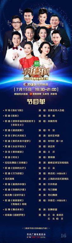 这台歌会,配合央视5套直播世界杯,连续16场在央视综艺频道播出精彩的音乐盛宴。受到了观众和网友的欢迎。最佳时刻,天天精彩。收视天天飘红。