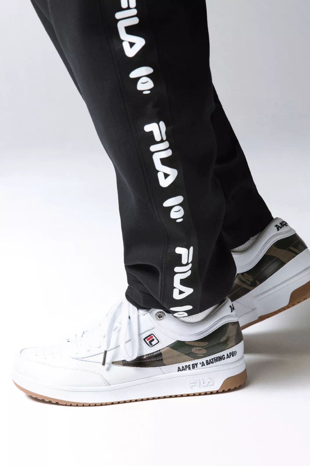 昨日推送了AAPE x FILA的联名鞋款,但双方的联名系列并未结束,在鞋款曝光后,随之而来的则是服装和具体的发售信息,AAPE x FILA 系列在单品上显现了T恤、卫衣以及运动裤。