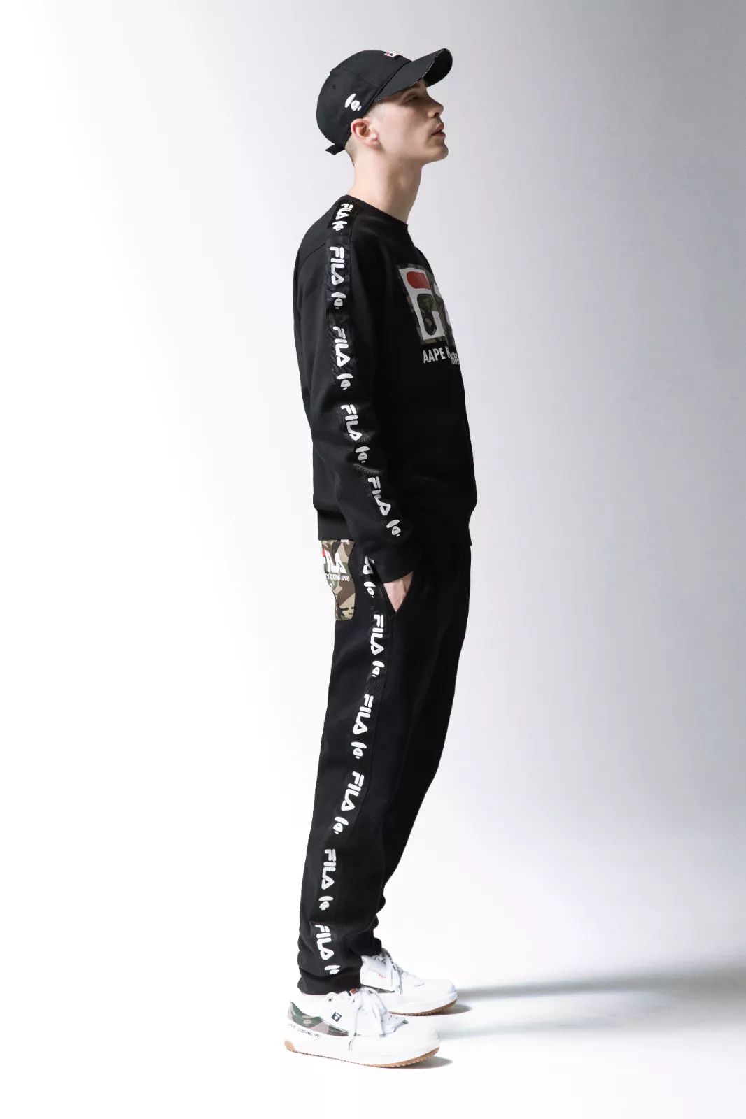 而此次联名的设计方面,最大化的彰显了两个品牌的特点特性,用AAPE象征性的迷彩融合FILA 运动元素,运用黑色当作核心,加入了双方的Logo,背后则搭配了硕大型的FILA品牌字样。